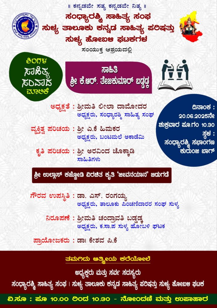 ಅಮರ ಸುದ್ದಿ ವಾರಪತ್ರಿಕೆಯಲ್ಲಿ ವರದಿಗಾರರಾಗಿ ಕರ್ತವ್ಯ ನಿರ್ವಹಿಸುತ್ತಿರುವ ಉಲ್ಲಾಸ್ ಕಜ್ಜೋಡಿ ರವರ ಮೊದಲ ಕೃತಿ “ಜೀವನಯಾನ” ಕವನ ಸಂಕಲನವು ಜೂ.20 ರಂದು ಬಿಡುಗಡೆಗೊಳ್ಳಲಿದ್ದು, ಸಂಧ್ಯಾರಶ್ಮಿ ಸಾಹಿತ್ಯ ಸಂಘ ಹಾಗೂ ಸುಳ್ಯ ತಾಲೂಕು ಕನ್ನಡ ಸಾಹಿತ್ಯ ಪರಿಷತ್ತಿನ ಸುಳ್ಯ ಹೋಬಳಿ ಘಟಕಗಳ ಸಂಯುಕ್ತ ಆಶ್ರಯದಲ್ಲಿ ಕುರುಂಜಿಬಾಗ್ ನ ಸಂಧ್ಯಾರಶ್ಮಿ ಸಭಾಂಗಣದಲ್ಲಿ ಜೂ.20 ರಂದು ನಡೆಯಲಿರುವ ಸಾಹಿತಿ ಕೆ.ಆರ್ ತೇಜಕುಮಾರ್ ಬಡ್ಡಡ್ಕ ರವರ ವ್ಯಕ್ತಿತ್ವ ಹಾಗೂ ಕೃತಿ ಪರಿಚಯದ “ತಿಂಗಳ ಸಾಹಿತ್ಯ ಸಂವಾದ ಮಾಲಿಕೆ” ಕಾರ್ಯಕ್ರಮದಲ್ಲಿ ಉಲ್ಲಾಸ್ ಕಜ್ಜೋಡಿ ರವರ ಮೊದಲ ಕೃತಿ “ಜೀವನಯಾನ” ಕವನ ಸಂಕಲನವು ಬಿಡುಗಡೆಗೊಳ್ಳಲಿದೆ.
