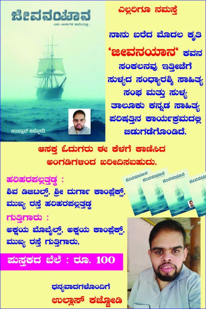 ಅಮರ ಸುದ್ದಿ ವಾರಪತ್ರಿಕೆಯಲ್ಲಿ ವರದಿಗಾರರಾಗಿ ಕಾರ್ಯನಿರ್ವಹಿಸುತ್ತಿರುವ ಉಲ್ಲಾಸ್ ಕಜ್ಜೋಡಿ ಯವರು ಬರೆದ ಮೊದಲ ಕೃತಿ “ಜೀವನಯಾನ” ಕವನ ಸಂಕಲನವು ಇತ್ತೀಚೆಗೆ ಸುಳ್ಯದ ಸಂಧ್ಯಾರಶ್ಮಿ ಸಾಹಿತ್ಯ ಸಂಘ ಹಾಗೂ ಸುಳ್ಯ ತಾಲೂಕು ಕನ್ನಡ ಸಾಹಿತ್ಯ ಪರಿಷತ್ತಿನ ಕಾರ್ಯಕ್ರಮದಲ್ಲಿ ಬಿಡುಗಡೆಗೊಂಡಿದ್ದು, ಆಸಕ್ತ ಓದುಗರು ಈ ಕೆಳಗಿನ ಅಂಗಡಿಗಳಿಂದ ಪುಸ್ತಕವನ್ನು ಖರೀದಿಸಬಹುದು