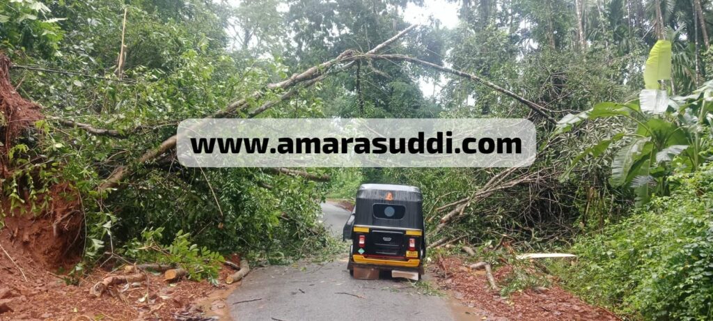 ಸುಳ್ಯದಲ್ಲಿ ನಿರಂತರವಾಗಿ ಸುರಿಯುತ್ತಿರುವ ಮಳೆಗೆ ಹಲವು ಕಡೆಗಳಲ್ಲಿ ಹಾನಿಯಾಗಿದ್ದು, ಅಲ್ಲಲ್ಲಿ ಮರಗಳು ಉರುಳಿ ಬಿದ್ದಿವೆ. ಚೊಕ್ಕಾಡಿ ಶೇಣಿ ಮುಖ್ಯ ರಸ್ತೆಯಲ್ಲಿ ಮರವೊಂದು ಅಡ್ಡಲಾಗಿ ಉರುಳಿ ಬಿದ್ದಿದ್ದು, ವಾಹನ ಸಂಚಾರಕ್ಕೆ ಅಡಚಣೆಯಾಗಿದೆ. ಸದ್ಯ ಲಘು ವಾಹನ ಸಂಚರಿಸುವಷ್ಟು ಮರವನ್ನು ತೆರವುಗೊಳಿಸಲಾಗಿದ್ದು, ಸಂಪೂರ್ಣ ಮರ ತೆರವುಗೊಳಿಸಬೇಕಾಗಿದೆ.