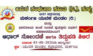 ಅಮರ ಸಂಘಟನಾ ಸಮಿತಿ(ರಿ.) ಸುಳ್ಯ ಇದರ ಆಶ್ರಯದಲ್ಲಿ ಮರ್ಕಂಜ ಯುವಕ ಮಂಡಲ(ರಿ.) ಮತ್ತು ಭಾರತೀಯ ಅಂಚೆ ಇಲಾಖೆ ಪುತ್ತೂರು ವಿಭಾಗದ ಸಹಕಾರದೊಂದಿಗೆ ಆಗಸ್ಟ್ 03 ಆದಿತ್ಯವಾರದಂದು ಮರ್ಕಂಜ ಯುವಕ ಮಂಡಲ ಸಭಾಭವನದಲ್ಲಿ “ಆಧಾರ್ ನೋಂದಣಿ ಹಾಗೂ ತಿದ್ದುಪಡಿ ಶಿಬಿರ” ನಡೆಯಲಿದೆ ಎಂದು ಶಿಬಿರದ ಆಯೋಜಕರು ಪ್ರಕಟಣೆಯಲ್ಲಿ ತಿಳಿಸಿದ್ದಾರೆ.ಆಧಾರ್ ನೋಂದಣಿ ಹಾಗೂ ತಿದ್ದುಪಡಿಗೆ ಬೇಕಾದ ದಾಖಲಾತಿಗಳು :...