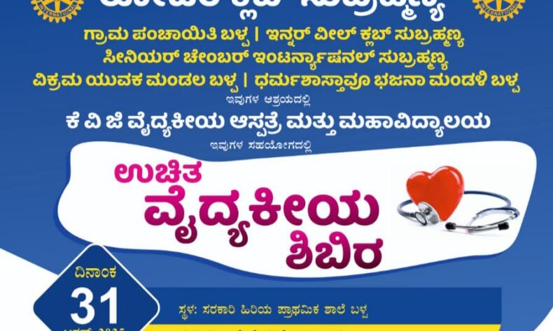 ರೋಟರಿ ಕ್ಲಬ್ ಸುಬ್ರಹ್ಮಣ್ಯ, ಗ್ರಾಮ ಪಂಚಾಯತ್ ಬಳ್ಪ, ಇನ್ನರ್ ವೀಲ್ ಕ್ಲಬ್ ಸುಬ್ರಹ್ಮಣ್ಯ, ಸೀನಿಯರ್ ಚೇಂಬರ್ ಇಂಟರ್ನ್ಯಾಷನಲ್ ಸುಬ್ರಹ್ಮಣ್ಯ, ವಿಕ್ರಮ ಯುವಕ ಮಂಡಲ ಬಳ್ಪ, ಧರ್ಮಶಾಸ್ತಾವೂ ಭಜನಾ ಮಂಡಳಿ ಬಳ್ಪ ಇವುಗಳ ಆಶ್ರಯದಲ್ಲಿ ಕೆ.ವಿ.ಜಿ ವೈದ್ಯಕೀಯ ಆಸ್ಪತ್ರೆ ಮತ್ತು ಮಹಾವಿದ್ಯಾಲಯ ಇವುಗಳ ಸಹಯೋಗದಲ್ಲಿ ಆ.31 ರಂದು ಬಳ್ಪ ಸರಕಾರಿ ಹಿರಿಯ ಪ್ರಾಥಮಿಕ ಶಾಲೆಯಲ್ಲಿ ಬೆಳಿಗ್ಗೆ 9:30 ರಿಂದ “ಉಚಿತ ವೈದ್ಯಕೀಯ ಶಿಬಿರ” ನಡೆಯಲಿದ್ದು, ಸುಬ್ರಹ್ಮಣ್ಯ ರೋಟರಿ ಕ್ಲಬ್ ನ ಅಧ್ಯಕ್ಷರಾದ ಜಯಪ್ರಕಾಶ್.ಆರ್ ಕಾರ್ಯಕ್ರಮದ ಅಧ್ಯಕ್ಷತೆ ವಹಿಸಲಿದ್ದಾರೆ.