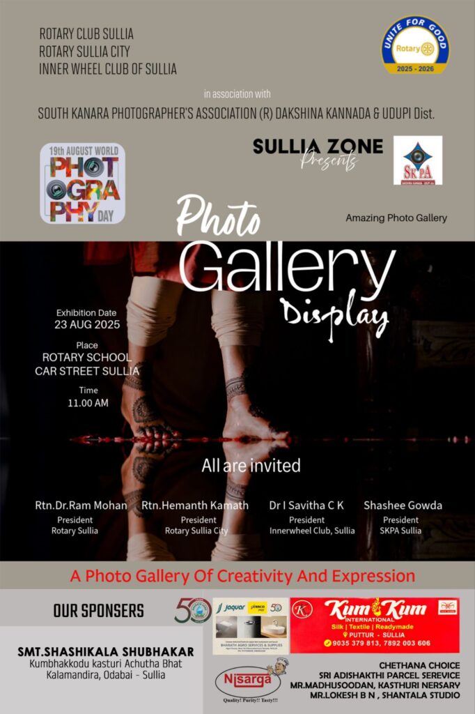 ವರ್ಲ್ಡ್ ಫೋಟೋಗ್ರಾಫಿ ಡೇ ಪ್ರಯುಕ್ತ ಆಯೋಜಿಸಿದ ಫೋಟೋ ಎಕ್ಸಿಬಿಷನ್ ಮತ್ತು ಮಕ್ಕಳ ರಾಧಾ ಕೃಷ್ಣ ಫೋಟೋ ಸ್ಪರ್ಧೆಯ ಬಹುಮಾನ ವಿತರಣೆಯು ಆ.23 ಶನಿವಾರದಂದು ಬೆಳಗ್ಗೆ 10.30ಕ್ಕೆ ರೋಟರಿ ಕ್ಲಬ್, ರೋಟರಿ ಇನ್ನರ್ವೀಲ್, ರೋಟರಿ ಸಿಟಿ, ಮತ್ತು ಸೌತ್ ಕೆನರಾ ಫೋಟೋಗ್ರಾಫರ್ಸ್ ಅಸೋಸಿಯೇಷನ್ ಸುಳ್ಯ ವಲಯ ಇದರ ಸಹಯೋಗದಲ್ಲಿ ರೋಟರಿ ಶಾಲಾ ಸಭಾಂಗಣದಲ್ಲಿ ನಡೆಯಲಿದೆ.