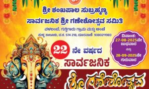 ವಳಲಂಬೆ ಶ್ರೀ ಶಂಖಪಾಲ ಸುಬ್ರಹ್ಮಣ್ಯ ಸಾರ್ವಜನಿಕ ಶ್ರೀ ಗಣೇಶೋತ್ಸವ ಸಮಿತಿ ವತಿಯಿಂದ 22 ವರ್ಷದ ಸಾರ್ವಜನಿಕ ಶ್ರೀ ಗಣೇಶೋತ್ಸವ ಕಾರ್ಯಕ್ರಮ ಆ.27 ಮತ್ತು 28 ರಂದು ನಡೆಯಲಿದೆ. ಆ.27 ಬುಧವಾರ ಬೆಳಿಗ್ಗೆ 9 ಗಂಟೆಗೆ ಗಣಪತಿ ಪ್ರತಿಷ್ಠೆ, ನಂತರ ಸಾರ್ವಜನಿಕ ಗಣಪತಿ ಹವನ, ಗಂಟೆ 10 ರಿಂದ ಅಕ್ಷರಾಭ್ಯಾಸ ಮತ್ತು ಮಕ್ಕಳಿಗೆ ಕಿವಿ ಚುಚ್ಚುವ ಕಾರ್ಯಕ್ರಮ...