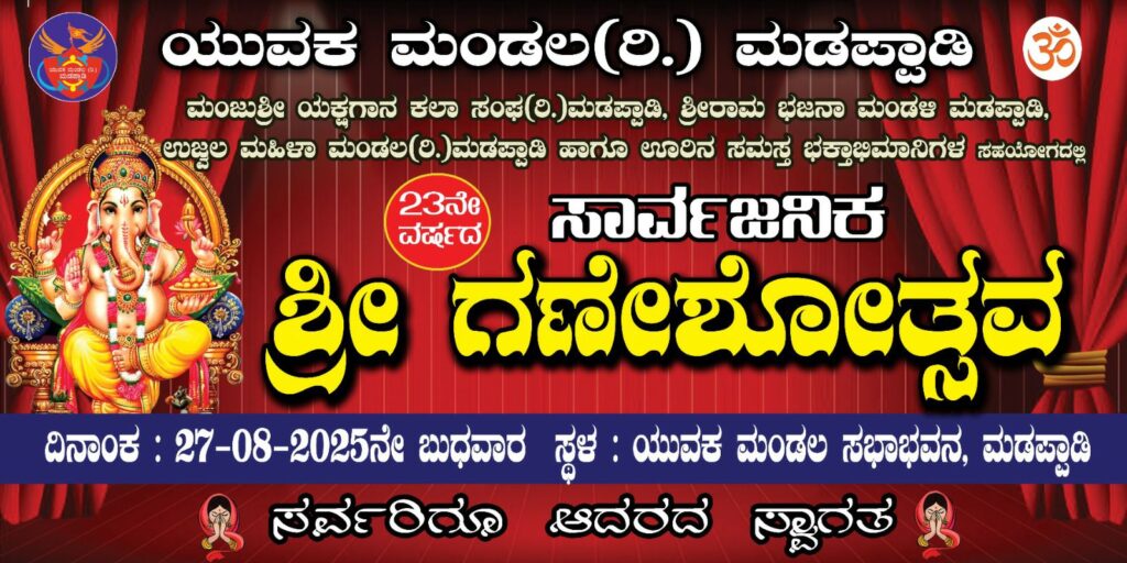 ಯುವಕ ಮಂಡಲ(ರಿ) ಮಡಪ್ಪಾಡಿ, ಮಂಜುಶ್ರೀ ಯಕ್ಷಗಾನ ಕಲಾ ಸಂಘ ಮಡಪ್ಪಾಡಿ, ಶ್ರೀ ರಾಮ ಭಜನಾ ಮಂಡಳಿ ಮಡಪ್ಪಾಡಿ, ಉಜ್ವಲ ಮಹಿಳಾ ಮಂಡಲ(ರಿ) ಮಡಪ್ಪಾಡಿ ಹಾಗೂ ಊರಿನ ಸಮಸ್ತ ಭಕ್ತಾಭಿಮಾನಿಗಳ ಸಹಯೋಗದೊಂದಿಗೆ 23ನೇ ವರ್ಷದ ಸಾರ್ವಜನಿಕ ಶ್ರೀ ಗಣೇಶೋತ್ಸವ ಕಾರ್ಯಕ್ರಮವು ಯುವಕ ಮಂಡಲ ಸಭಾಭವನ ಮಡಪ್ಪಾಡಿ ಇಲ್ಲಿ ನಡೆಯಲಿದೆ.