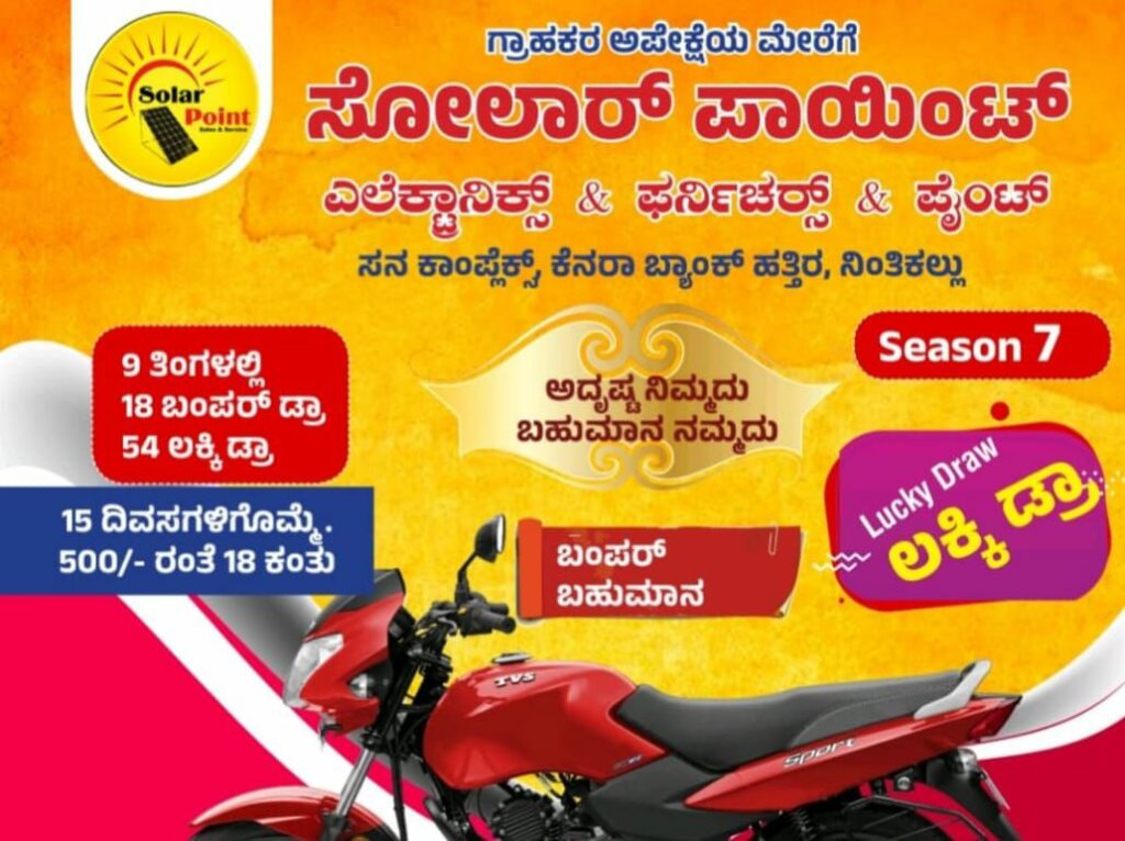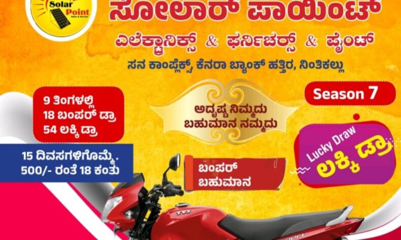 ಗ್ರಾಹಕರ ಅಪೇಕ್ಷೆಯ ಮೇರೆಗೆ ನಿಂತಿಕಲ್ಲಿನ ಸೋಲಾರ್ ಪಾಯಿಂಟ್ ಎಲೆಕ್ಟ್ರಾನಿಕ್ಸ್ & ಫರ್ನಿಚರ್ಸ್ & ಪೈಂಟ್ ನಲ್ಲಿ ಬಂಪರ್ ಬಹುಮಾನ ಲಕ್ಕಿ ಡ್ರಾ ಸೀಸನ್ 7 ಆರಂಭಗೊಂಡಿದೆ.