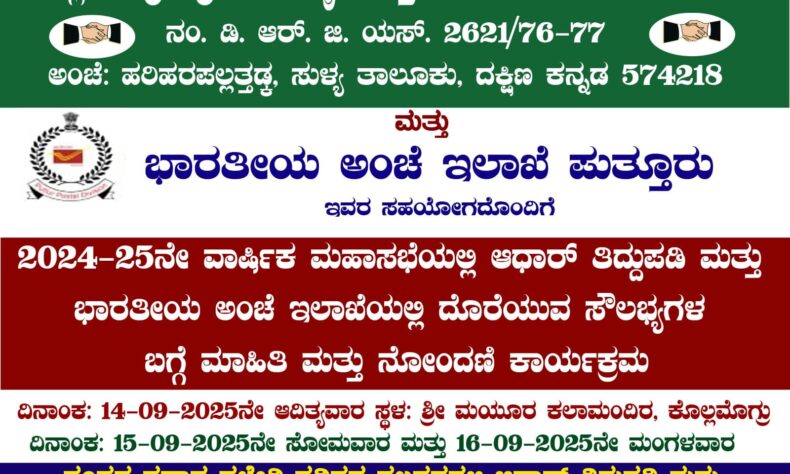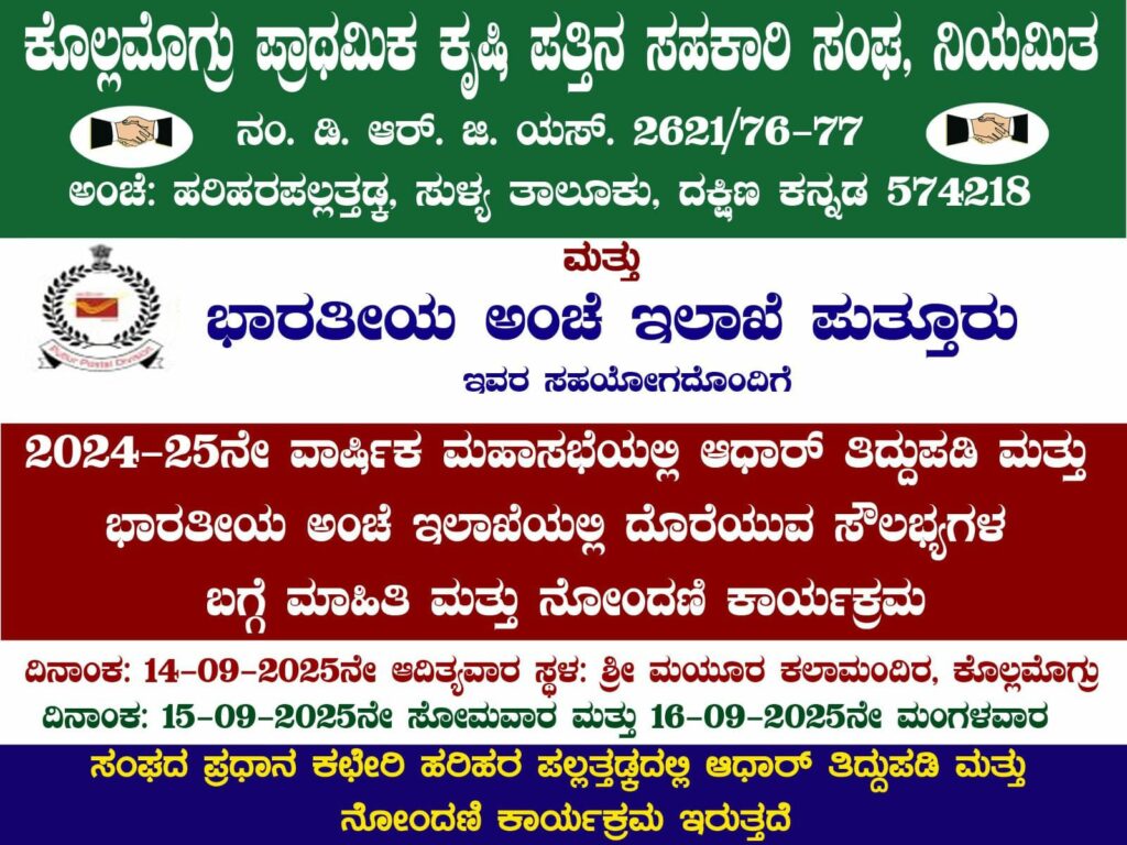 ಸೆ.14 ಆದಿತ್ಯವಾರದಂದು ಕೊಲ್ಲಮೊಗ್ರು-ಹರಿಹರ ಪ್ರಾಥಮಿಕ ಕೃಷಿ ಪತ್ತಿನ ಸಹಕಾರಿ ಸಂಘದ ವಾರ್ಷಿಕ ಮಹಾಸಭೆ ನಡೆಯಲಿದ್ದು, ಈ ಸಂದರ್ಭದಲ್ಲಿ ಸೊಸೈಟಿ ಹಾಗೂ ಭಾರತೀಯ ಅಂಚೆ ಇಲಾಖೆ ಪುತ್ತೂರು ಇವುಗಳ ಸಹಯೋಗದೊಂದಿಗೆ ಕೊಲ್ಲಮೊಗ್ರದ ಮಯೂರ ಕಲಾಮಂದಿರದಲ್ಲಿ ಭಾರತೀಯ ಅಂಚೆ ಇಲಾಖೆಯಲ್ಲಿ ದೊರೆಯುವ ಸೌಲಭ್ಯಗಳ ಬಗ್ಗೆ ಮಾಹಿತಿ ಮತ್ತು ಆಧಾರ್ ತಿದ್ದುಪಡಿ ಹಾಗೂ ನೋಂದಣಿ ಕಾರ್ಯಕ್ರಮ ನಡೆಯಲಿದೆ.