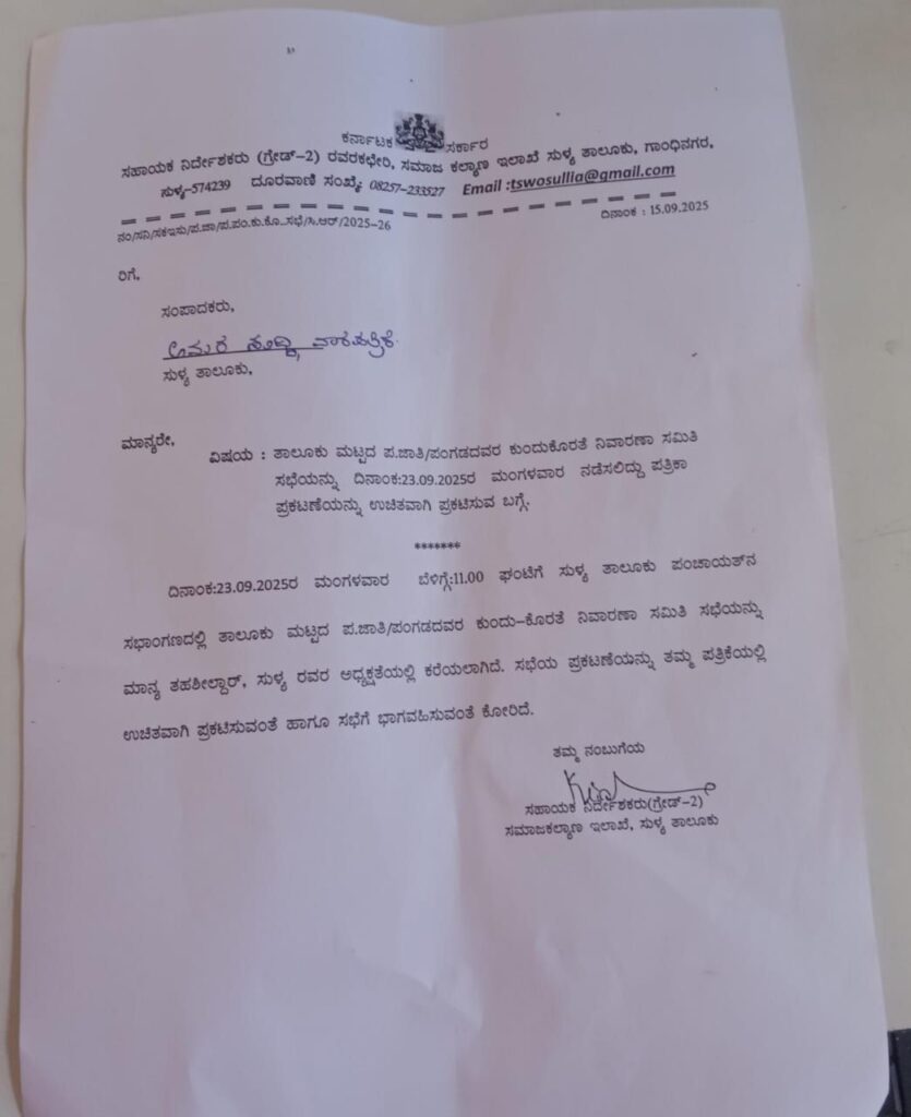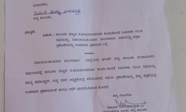 ತಾಲೂಕು ಮಟ್ಟದ ಪ.ಜಾತಿ/ಪಂಗಡದವರ ಕುಂದುಕೊರತೆ ನಿವಾರಣಾ ಸಮಿತಿ ಸಭೆಯು ಸೆ.23 ಮಂಗಳವಾರ ಬೆಳಿಗ್ಗೆ:11.00 ಘಂಟೆಗೆ ಸುಳ್ಯ ತಾಲೂಕು ಪಂಚಾಯತ್‌ ಸಭಾಂಗಣದಲ್ಲಿ ತಹಶೀಲ್ದಾರ್ ರವರ ಅಧ್ಯಕ್ಷತೆಯಲ್ಲಿ ನಡೆಯಲಿದೆ ಎಂದು ಸಮಾಜ ಕಲ್ಯಾಣ ಇಲಾಖೆಯ ಸಹಾಯಕ ನಿರ್ದೇಶಕರು ಪ್ರಕಟಣೆಯಲ್ಲಿ ತಿಳಿಸಿದ್ದಾರೆ.