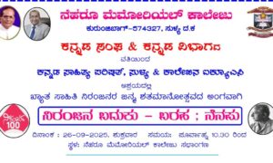 ಅಂತಾರಾಷ್ಟ್ರೀಯ ಖ್ಯಾತಿಯ ಸುಳ್ಯದ ಸಾಹಿತಿ ನಿರಂಜನರೆಂದೇ ಪ್ರಸಿದ್ಧರಾದ ಕುಲ್ಕುಂದ ಶಿವರಾಯರ ಜನ್ಮ ಶತಮಾನೋತ್ಸವದ ಪ್ರಯುಕ್ತ "ನಿರಂಜನ ಬದುಕು - ಬರಹ : ನೆನಪು" ಕಾರ್ಯಕ್ರಮವನ್ನು ಸುಳ್ಯದ ನೆಹರೂ ಮೆಮೋರಿಯಲ್ ಕಾಲೇಜಿನಲ್ಲಿ ಸೆಪ್ಟೆಂಬರ್ 26,2025ನೇ ಶುಕ್ರವಾರದಂದು ಹಮ್ಮಿಕೊಳ್ಳಲಾಗಿದೆ. ಕಾಲೇಜಿನ ಕನ್ನಡ ಸಂಘ ಹಾಗೂ ಕನ್ನಡ ವಿಭಾಗದ ವತಿಯಿಂದ ಕನ್ನಡ ಸಾಹಿತ್ಯ ಪರಿಷತ್ತು, ಸುಳ್ಯ ಹಾಗೂ ಕಾಲೇಜಿನ ಐಕ್ಯೂಎಸಿ...