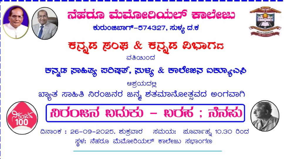 ಸೆ.26 : ಸುಳ್ಯದ ನೆಹರೂ ಮೆಮೋರಿಯಲ್ ಕಾಲೇಜಿನಲ್ಲಿ ಖ್ಯಾತ ಸಾಹಿತಿ ನಿರಂಜನರ ಜನ್ಮ ಶತಮಾನೋತ್ಸವದ ಪ್ರಯುಕ್ತ “ನಿರಂಜನ ಬದುಕು – ಬರಹ: ನೆನಪು” ಕಾರ್ಯಕ್ರಮ
