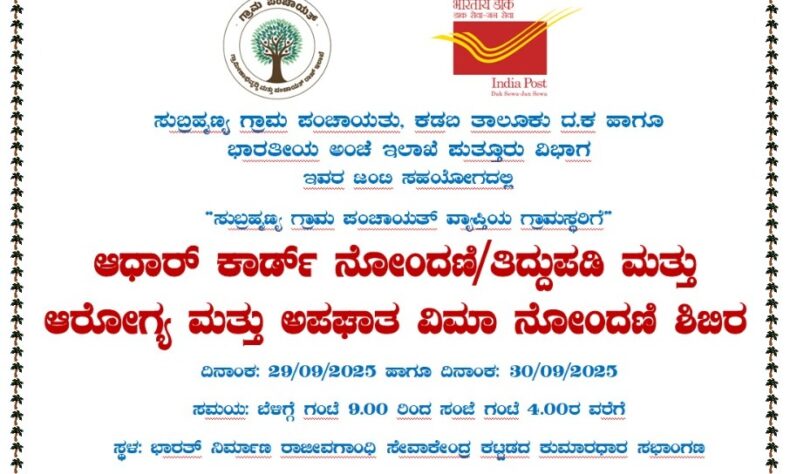 ಸೆ.29 ಹಾಗೂ 30 ರಂದು ಸುಬ್ರಹ್ಮಣ್ಯದಲ್ಲಿ ಆಧಾರ್ ನೋಂದಣಿ ಮತ್ತು ತಿದ್ದುಪಡಿ ಶಿಬಿರ