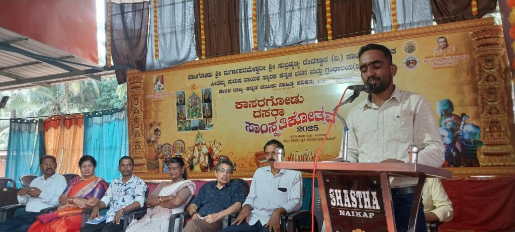ಕೇರಳ ರಾಜ್ಯದ ಕಾಸರಗೋಡಿನ ಪಾಂಗಾಳ ಶ್ರೀ ದುರ್ಗಾಪರಮೇಶ್ವರಿ ಶ್ರೀ ಸುಬ್ರಹ್ಮಣ್ಯ ಸ್ವಾಮಿ ದೇವಸ್ಥಾನದ ದುರ್ಗಾಂಬಾ ವೇದಿಕೆಯಲ್ಲಿ ಸುಪ್ರಸಿದ್ಧ ಕವಿ ಡಾ. ಸುರೇಶ್ ನೆಗಳಗುಳಿ ಅಧ್ಯಕ್ಷತೆಯಲ್ಲಿ ಸೆ.27ರಂದು ನಡೆದ ಕಾಸರಗೋಡು ದಸರಾ ಕವಿಗೋಷ್ಠಿ-2025ರಲ್ಲಿ ಯುವಕವಿ ಎಂ.ಎ.ಮುಸ್ತಫಾ ಬೆಳ್ಳಾರೆ ಸ್ವರಚಿತ ‘ಬಾಳು ಬಂಗಾರವಾಗಲಿ’ ಶೀರ್ಷಿಕೆಯ ಕವನ ವಾಚಿಸಿದರು.