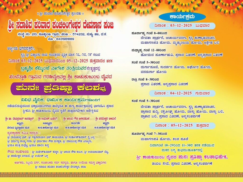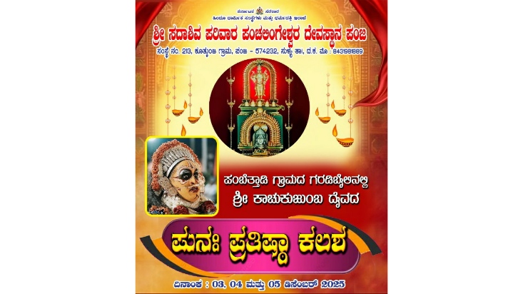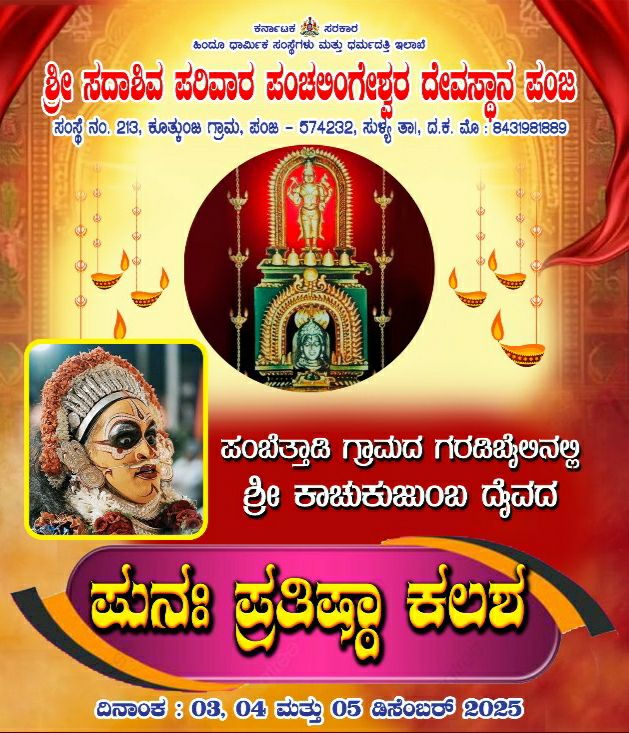 ಪಂಜ ಶ್ರೀ ಸದಾಶಿವ ಪರಿವಾರ ಪಂಚಲಿಂಗೇಶ್ವರ ದೇವಸ್ಥಾನದ ಪಂಬೆತ್ತಾಡಿ ಗ್ರಾಮದ ಗರಡಿಬೈಲಿನಲ್ಲಿರುವ ಶ್ರೀ ಕಾಚುಕುಜುಂಬ ದೈವದ ಪುನಃ ಪ್ರತಿಷ್ಠಾ ಕಲಶವು ವಿವಿಧ ವೈದಿಕ ಹಾಗೂ ಧಾರ್ಮಿಕ ಕಾರ್ಯಕ್ರಮಗಳೊಂದಿಗೆ ಡಿಸೆಂಬರ್ 03 ಬುಧವಾರದಿಂದ 05 ಶುಕ್ರವಾರದವರೆಗೆ ನಡೆಯಲಿದ್ದು, ಡಿ.03 ಬುಧವಾರದಂದು ಪೂರ್ವಾಹ್ನ 8:00 ಗಂಟೆಯಿಂದ ದೇವತಾ ಪ್ರಾರ್ಥನೆ, ಆಚಾರ್ಯವರಣ, ಸ್ವಸ್ತಿ ಪುಣ್ಯಾಹವಾಚನ, ಮಹಾಗಣಪತಿ ಹೋಮ, ಮೃತ್ಯುಂಜಯ ಹೋಮ ಹಾಗೂ ಆಶ್ಲೇಷ ಬಲಿ ನಡೆಯಲಿದ್ದು, ಮದ್ಯಾಹ್ನ 12:00 ಗಂಟೆಯಿಂದ ಹೋಮದ ಪೂರ್ಣಾಹುತಿ, ಪ್ರಸಾದ ವಿತರಣೆ, ಅನ್ನಪ್ರಸಾದ ವಿತರಣೆ, ಸಂಜೆ 5:00 ಗಂಟೆಯಿಂದ ದುರ್ಗಾಪೂಜೆ, ಸುದರ್ಶನ ಹೋಮ, ಅಘೋರ ಹೋಮ ಹಾಗೂ ವನದುರ್ಗಾ ಹೋಮ ನಡೆದು ರಾತ್ರಿ 8:30 ರಿಂದ ಪ್ರಸಾದ ವಿತರಣೆ ಹಾಗೂ ಅನ್ನಪ್ರಸಾದ ವಿತರಣೆ ನಡೆಯಲಿದೆ.