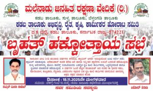 ಮಲೆನಾಡು ಜನಹಿತ ರಕ್ಷಣಾ ವೇದಿಕೆ(ರಿ.) ದಕ್ಷಿಣ ಕನ್ನಡ ಹಾಗೂ ಕಡಬ ತಾಲೂಕು ಅಭಿವೃದ್ಧಿ, ರೈತ, ಕೃಷಿ, ಕಾರ್ಮಿಕರ ಹೋರಾಟ ಸಮಿತಿ ಇವುಗಳ ಸಹಯೋಗದೊಂದಿಗೆ ನವೆಂಬರ್ 18 ಮಂಗಳವಾರದಂದು ಬೆಳಿಗ್ಗೆ 10:30ಕ್ಕೆ ಕಡಬ ತಾಲೂಕು ಕಚೇರಿಯ ಮುಂಭಾಗದಲ್ಲಿ “ಬೃಹತ್ ಹಕ್ಕೊತ್ತಾಯ ಸಭೆ” ನಡೆಯಲಿದ್ದು, "ಸಾಗುವಳಿ ಚೀಟಿ ನೀಡಿ ಹಲವಾರು ವರ್ಷಗಳು ಕಳೆದರೂ ಪ್ಲಾಟಿಂಗ್ ಆಗದೇ ಇರುವುದರಿಂದ ಜಂಟಿ...