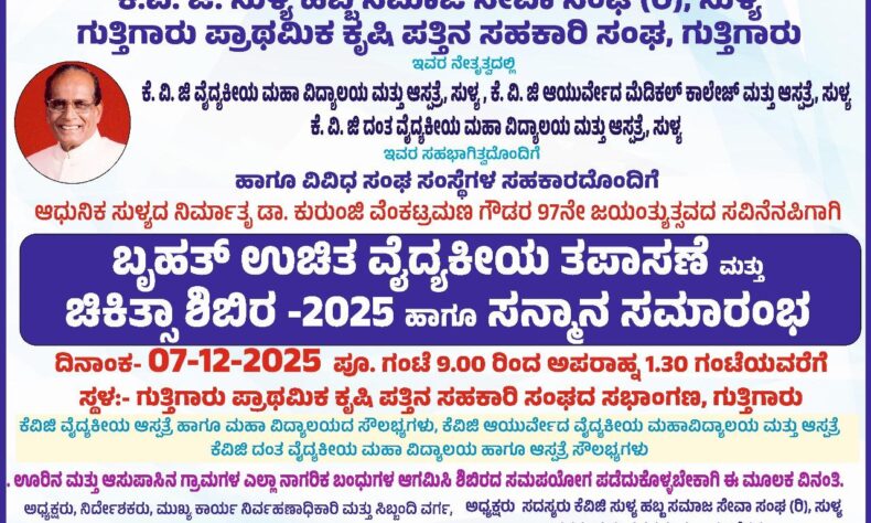 ಗುತ್ತಿಗಾರು : ಡಿ.07 ರಂದು “ಬೃಹತ್ ಉಚಿತ ವೈದ್ಯಕೀಯ ತಪಾಸಣೆ ಮತ್ತು ಚಿಕಿತ್ಸಾ ಶಿಬಿರ-2025 ಹಾಗೂ ಸನ್ಮಾನ ಸಮಾರಂಭ”