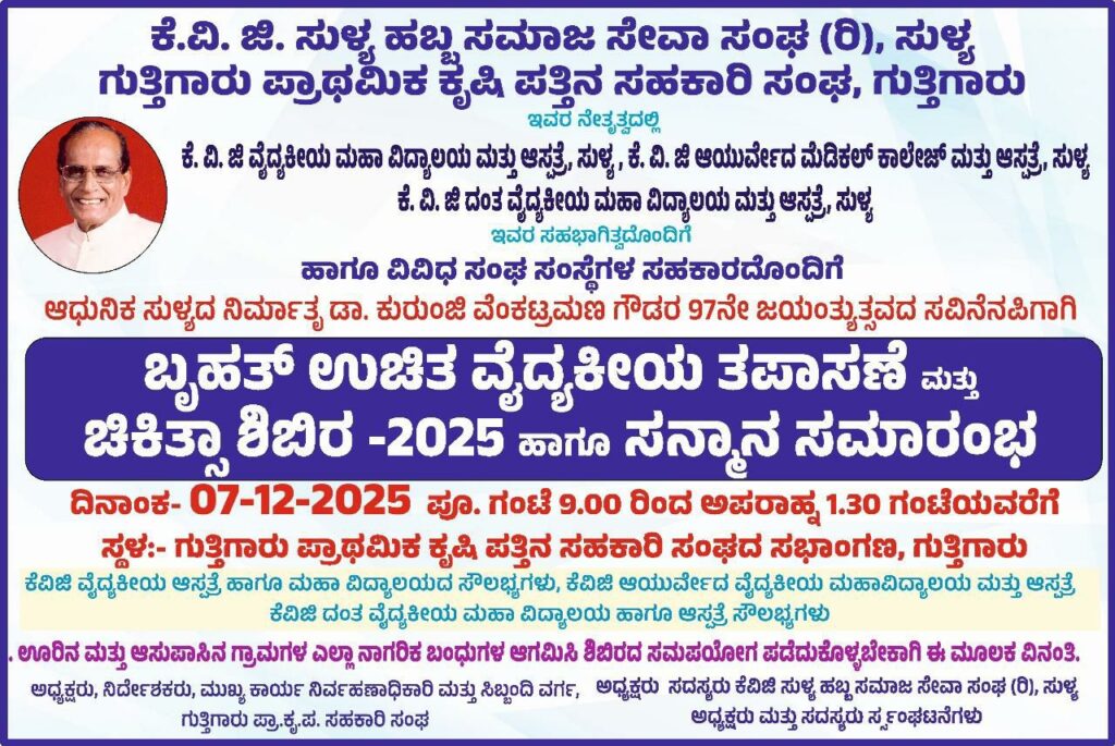 ಕೆ.ವಿ.ಜಿ ಸುಳ್ಯ ಹಬ್ಬ ಸಮಾಜ ಸೇವಾ ಸಂಘ(ರಿ.) ಸುಳ್ಯ ಹಾಗೂ ಗುತ್ತಿಗಾರು ಪ್ರಾಥಮಿಕ ಕೃಷಿ ಪತ್ತಿನ ಸಹಕಾರಿ ಸಂಘ(ರಿ.) ಇದರ ನೇತೃತ್ವದಲ್ಲಿ ಕೆ.ವಿ.ಜಿ ವೈದ್ಯಕೀಯ ಮಹಾವಿದ್ಯಾಲಯ ಮತ್ತು ಆಸ್ಪತ್ರೆ ಸುಳ್ಯ, ಕೆ.ವಿ.ಜಿ ಆಯುರ್ವೇದ ಮೆಡಿಕಲ್ ಕಾಲೇಜು ಮತ್ತು ಆಸ್ಪತ್ರೆ ಸುಳ್ಯ ಹಾಗೂ ಕೆ.ವಿ.ಜಿ ದಂತ ವೈದ್ಯಕೀಯ ಮಹಾವಿದ್ಯಾಲಯ ಮತ್ತು ಆಸ್ಪತ್ರೆ ಸುಳ್ಯ ಇವುಗಳ ಸಹಭಾಗಿತ್ವದೊಂದಿಗೆ ಹಾಗೂ ವಿವಿಧ ಸಂಘ-ಸಂಸ್ಥೆಗಳ ಸಹಕಾರದೊಂದಿಗೆ ಆಧುನಿಕ ಸುಳ್ಯದ ನಿರ್ಮಾತೃ ಡಾ. ಕುರುಂಜಿ ವೆಂಕಟ್ರಮಣ ಗೌಡರ 97ನೇ ಜಯಂತ್ಯುತ್ಸವದ ಸವಿನೆನಪಿಗಾಗಿ ಡಿಸೆಂಬರ್ 07 ರಂದು ಗುತ್ತಿಗಾರು ಪ್ರಾಥಮಿಕ ಕೃಷಿ ಪತ್ತಿನ ಸಹಕಾರಿ ಸಂಘದ ಸಭಾಂಗಣದಲ್ಲಿ ಪೂರ್ವಾಹ್ನ 9:00 ಗಂಟೆಯಿಂದ ಅಪರಾಹ್ನ 1:30 ರವರೆಗೆ “ಬೃಹತ್ ಉಚಿತ ವೈದ್ಯಕೀಯ ತಪಾಸಣೆ ಮತ್ತು ಚಿಕಿತ್ಸಾ ಶಿಬಿರ-2025 ಹಾಗೂ ಸನ್ಮಾನ ಸಮಾರಂಭ” ನಡೆಯಲಿದ್ದು, ಊರಿನ ಹಾಗೂ ಆಸುಪಾಸಿನ ಗ್ರಾಮಗಳ ಎಲ್ಲಾ ಸಾರ್ವಜನಿಕರು ಆಗಮಿಸಿ ಶಿಬಿರದ ಸದುಪಯೋಗವನ್ನು ಪಡೆದುಕೊಳ್ಳುವಂತೆ ಶಿಬಿರದ ಆಯೋಜಕರು ಪ್ರಕಟಣೆಯಲ್ಲಿ ತಿಳಿಸಿದ್ದಾರೆ.(ವರದಿ : ಉಲ್ಲಾಸ್ ಕಜ್ಜೋಡಿ)