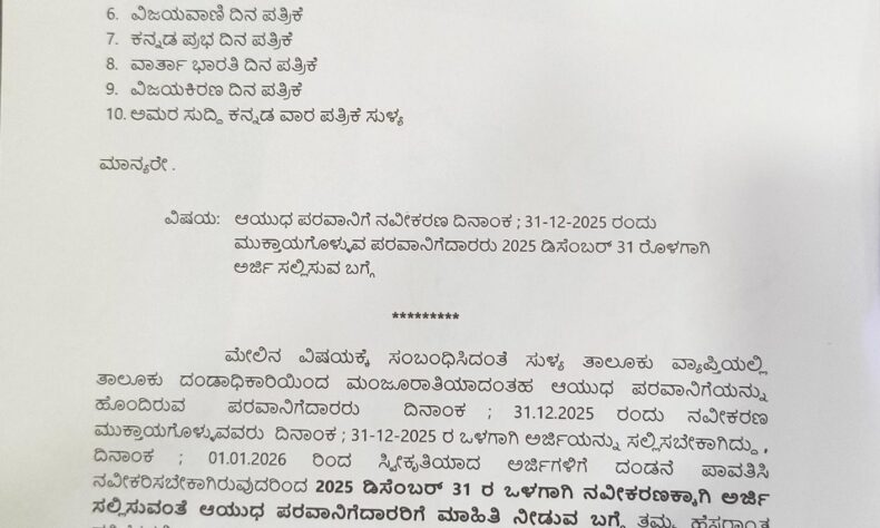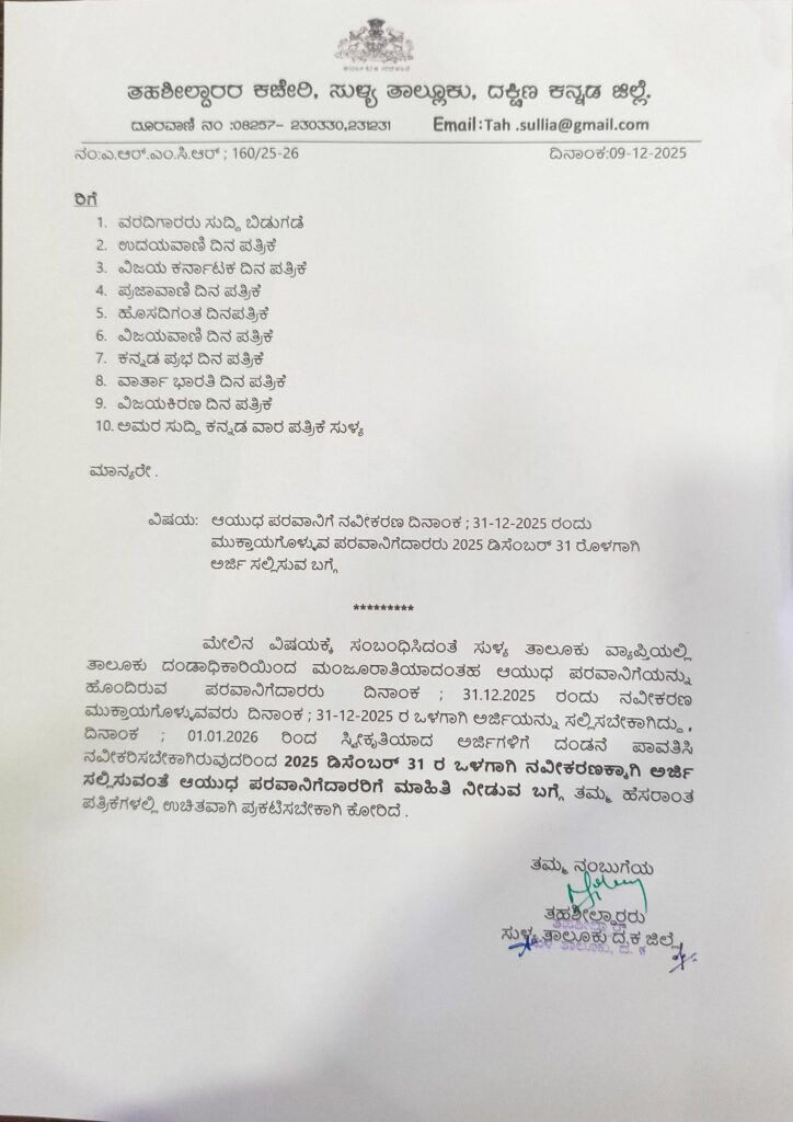 ಸುಳ್ಯ ತಾಲೂಕು ವ್ಯಾಪ್ತಿಯಲ್ಲಿ ತಾಲೂಕು ದಂಡಾಧಿಕಾರಿಯಿಂದ ಮಂಜೂರಾತಿಯಾದ ಆಯುಧ ಪರವಾನಿಗೆಯನ್ನು ಹೊಂದಿ ಡಿ. 31 ರಂದು ನವೀಕರಣ ಮುಕ್ತಾಯಗೊಳ್ಳುವ ಪರವಾನಿಗೆದಾರರು ಡಿ. 31 ರ ಒಳಗಾಗಿ ನವೀಕರಣಕ್ಕಾಗಿ ಅರ್ಜಿಯನ್ನು ಸಲ್ಲಿಸಬೇಕು. ದಿನಾಂಕ 01.01.2026 ರಿಂದ ಸ್ವೀಕೃತಿಯಾದ ಅರ್ಜಿಗಳಿಗೆ ದಂಡನೆ ಪಾವತಿಸಿ ನವೀಕರಿಸಬೇಕಾಗಿರುವುದರಿಂದ 2025 ಡಿಸೆಂಬರ್ 31 ರ ಒಳಗಾಗಿ ನವೀಕರಣಕ್ಕಾಗಿ ಅರ್ಜಿ ಸಲ್ಲಿಸುವಂತೆ ಸುಳ್ಯ ತಹಶೀಲ್ದಾರ್ ಪ್ರಕಟಣೆಯಲ್ಲಿ ತಿಳಿಸಿದ್ದಾರೆ.