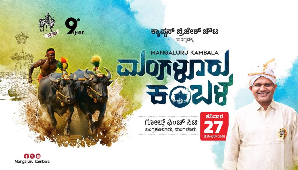 ಮಂಗಳೂರು: ನಗರದ ಬಂಗ್ರಕೂಳೂರಿನ ಗೋಲ್ಡ್ ಪಿಂಚ್ ಸಿಟಿಯ ರಾಮ-ಲಕ್ಷ್ಮಣ ಜೋಡು ಕೆರೆಯಲ್ಲಿ ಡಿ.27ರಂದು 9ನೇ ವರ್ಷದ ‘ಮಂಗಳೂರು ಕಂಬಳ’ ನವ-ವಿಧ ಕಾರ್ಯಕ್ರಮಗಳೊಂದಿಗೆ ವೈಶಿಷ್ಟ್ಯಪೂರ್ಣವಾಗಿ ನಡೆಯಲಿದೆ ಎಂದು ಕಂಬಳ ಸಮಿತಿ ಅಧ್ಯಕ್ಷರು ಹಾಗೂ ದಕ್ಷಿಣ ಕನ್ನಡ ಸಂಸದರಾದ ಕ್ಯಾ. ಬ್ರಿಜೇಶ್ ಚೌಟ ತಿಳಿಸಿದ್ದಾರೆ.