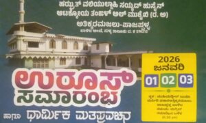ಬಾಳಿಲ ಗ್ರಾಮದ ಅತ್ತಿಕರಮಜಲು ಪಾಜಪಳ್ಳ ಮಸೀದಿಯ ವಠಾರದಲ್ಲಿ ಅಂತ್ಯ ವಿಶ್ರಾಂತಿಗೊಳ್ಳುತ್ತಿರುವ ಹಝ್ರತ್ ವಲಿಯುಲ್ಲಾಹಿ ಸಯ್ಯದ್ ಹುಸೈನ್ ಆಟಕ್ಕೋಯ ತಂಙಲ್ ಅಲ್ ಮುಶೈಖಿ(ರ.ಅ)ರವರ ಹೆಸರಿನಲ್ಲಿ ಎರಡು ವರುಷಕ್ಕೊಮ್ಮೆ ಆಚರಿಸಿಕೊಂಡು ಬರುತ್ತಿರುವ ಉರೂಸ್ ಸಮಾರಂಭವು ಜ 2026 ನೇ 1,2,3 ರಂದು ಬಾಳಿಲ ಅತ್ತಿಕರಮಜಲಿನ ಮುಹಿಯುದ್ದೀನ್ ಜುಮುಅ: ಮಸೀದಿಯ ವಠಾರದಲ್ಲಿ ಮಗ್ರಿಬ್ ನಮಾಝಿನ ಬಳಿಕ ನಡೆಯಲಿದ್ದು, ಪ್ರಮುಖ ವಿದ್ವಾಂಸರು...