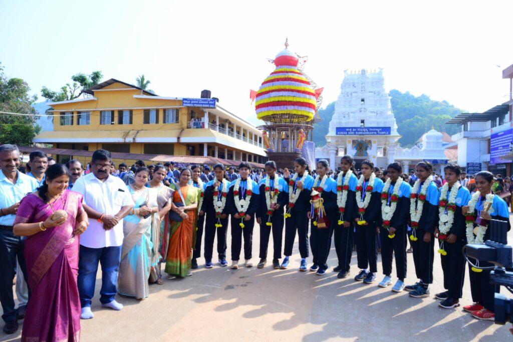 ವಿಜೇತ ತಂಡ ಮತ್ತು  ರಾಷ್ಟ್ರಮಟ್ಟದ ಪಂದ್ಯಾಟದಲ್ಲಿ ಆಟವಾಡಿದ್ದ ಸುಬ್ರಹ್ಮಣ್ಯದ ಎಸ್.ಎಸ್.ಪಿ.ಯು ಕಾಲೇಜಿನ ವಿದ್ಯಾರ್ಥಿನಿ ತಪಸ್ಯಾ.ಎಸ್ ನಾಯಕ್ ಅವರನ್ನು ಅದ್ದೂರಿಯಾಗಿ  ಶ್ರೀ ದೇವಳದ ಮುಂಭಾಗದಲ್ಲಿ ಗೌರವಿಸಲಾಯಿತು.
