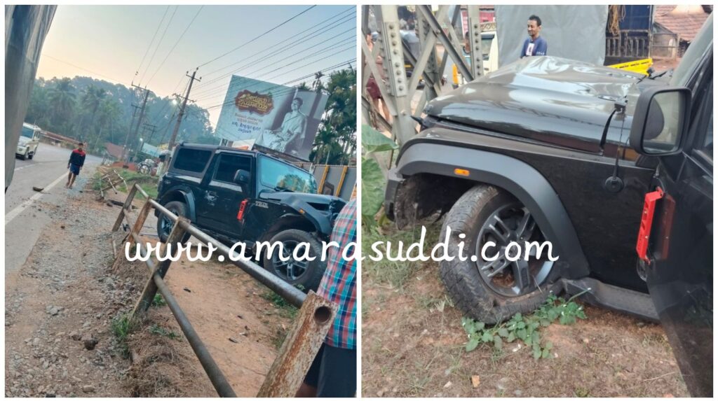 ಸುಳ್ಯದ ಮೊಗರ್ಪಣೆ ಸಮೀಪ ಜೀಪೊಂದು ಚಾಲಕನ ನಿಯಂತ್ರಣ ತಪ್ಪಿ ರಸ್ತೆ ಬದಿಗೆ ಸರಿದು ತಡೆಬೇಲಿಗೆ ಗುದ್ದಿದ ಘಟನೆ ಇಂದು ಮಂಜಾನೆ ನಡೆದಿದೆ. ಕಾರು ಬೆಂಗಳೂರಿನಿಂದ ಪುತ್ತೂರು ಕಡೆಗೆ ತೆರಳುತ್ತಿತ್ತು. ಕಾರಿನಲ್ಲಿ ಪತಿ,ಪತ್ನಿ ಮಗು ಇದ್ದು ಅಪಾಯದಿಂದ ಪಾರಾಗಿದ್ದಾರೆ.