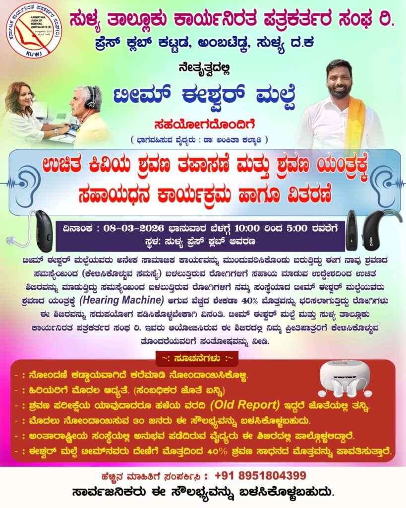 ಸುಳ್ಯ : ಮಾ.08 ರಂದು “ಶ್ರವಣ ತಪಾಸಣೆ ಮತ್ತು ಶ್ರವಣ ಯಂತ್ರಕ್ಕೆ ಸಹಾಯಧನ ಕಾರ್ಯಕ್ರಮ ಹಾಗೂ ವಿತರಣೆ” – ಕಾರ್ಯನಿರತ ಪತ್ರಕರ್ತರ ಸಂಘ ಹಾಗೂ ಟೀಮ್ ಈಶ್ವರ್ ಮಲ್ಪೆ ಸಹಯೋಗ