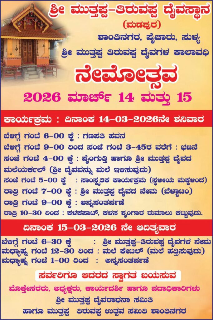 ಪೈಚಾರು – ಶಾಂತಿನಗರದ ಶ್ರೀ ಮುತ್ತಪ್ಪ – ತಿರುವಪ್ಪ ದೈವಸ್ಥಾನದಲ್ಲಿ ಶ್ರೀ ಮುತ್ತಪ್ಪ – ತಿರುವಪ್ಪ ದೈವಗಳ ಕಾಲಾವಧಿ ನೇಮೋತ್ಸವವು ಮಾ.14 ಮತ್ತು 15ರಂದು ಜರುಗಲಿದೆ.