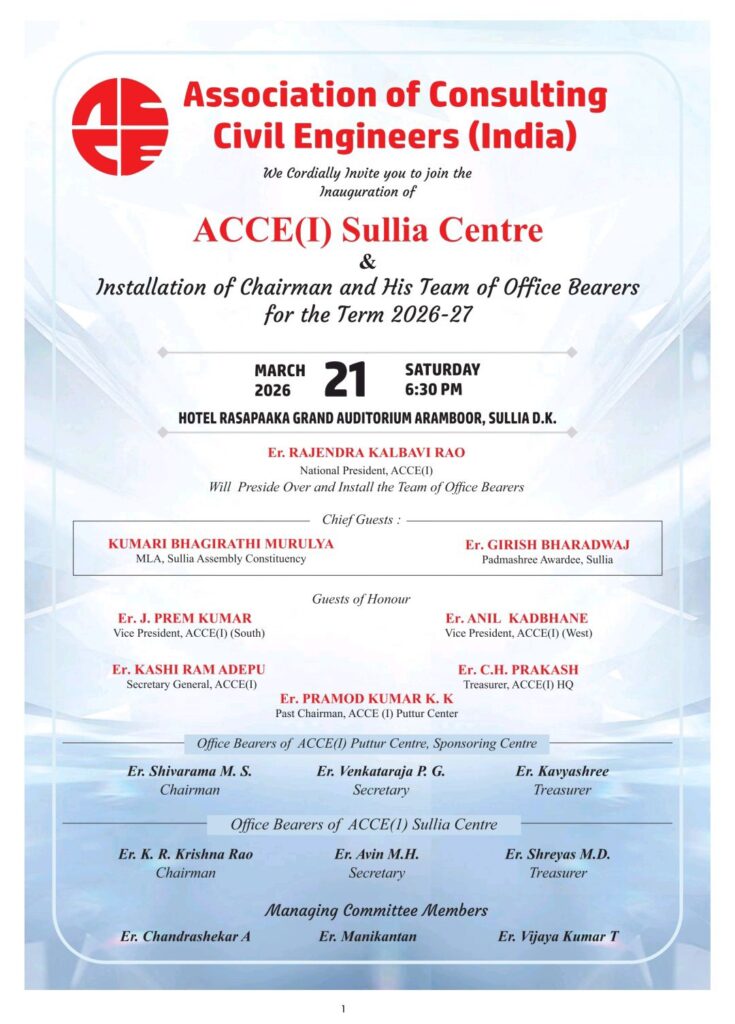 ಅಸೋಸಿಯೇಷನ್ ಆಫ್ ಕನ್ಸಲ್ಟಿಂಗ್ ಸಿವಿಲ್ ಇಂಜಿನಿಯರ್ಸ್(ಇಂಡಿಯಾ) ಸುಳ್ಯ ಸೆಂಟರ್ ಅಧ್ಯಕ್ಷರಾಗಿ ಕೆ.ಆರ್ ಕೃಷ್ಣರಾವ್ ಆಯ್ಕೆ ; ಕಾರ್ಯದರ್ಶಿ ಅವಿನ್.ಎಂ.ಹೆಚ್ – ಕೋಶಾಧಿಕಾರಿ ಶ್ರೇಯಸ್.ಎಂ.ಡಿ