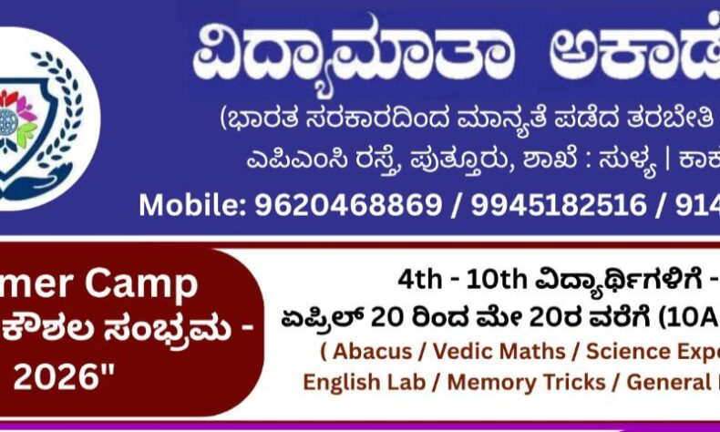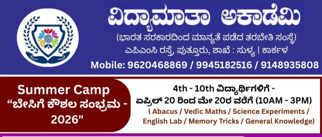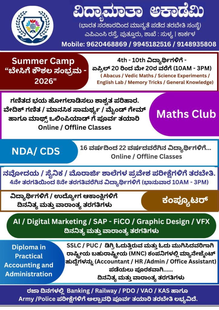 16 ರಿಂದ 22 ವರ್ಷದವರೆಗಿನ ವಿದ್ಯಾರ್ಥಿಗಳಿಗೆ ರಕ್ಷಣಾ ಪಡೆಗಳಲ್ಲಿ ಅಧಿಕಾರಿಯಾಗುವ ಪ್ರಯತ್ನದಲ್ಲಿರುವವರಿಗೆ NDA ಮತ್ತು CDS ಹಾಗೂ 18 ವರ್ಷ ಮೇಲ್ಪಟ್ಟ ಅಭ್ಯರ್ಥಿಗಳಿಗೆ ರಾಜ್ಯ ಸರಕಾರ ಹಾಗೂ ಕೇಂದ್ರ ಸರಕಾರದ ವಲಯದಲ್ಲಿರುವ ಎಲ್ಲಾ ಸ್ಪರ್ಧಾತ್ಮಕ ಪರೀಕ್ಷೆಗಳಿಗೆ ನೇರ ತರಗತಿ ಮತ್ತು ಆನ್ಲೈನ್ ತರಗತಿಗಳು ಅಲ್ಲದೇ ರಜಾ ದಿನಗಳಲ್ಲಿ ಬ್ಯಾಂಕಿಂಗ್, ರೈಲ್ವೆ, PDO, VAO, KAS ಹಾಗೂ ಭಾರತೀಯ ಸೇನೆ, ಪೊಲೀಸ್ ಪರೀಕ್ಷೆಗಳಿಗೆ ಸೀಮಿತ ಅವಧಿಯ ಪೂರ್ವ ತಯಾರಿ ತರಬೇತಿಗಳನ್ನು ವಿದ್ಯಾಮಾತಾ ಅಕಾಡೆಮಿಯು ಒದಗಿಸುತ್ತಿದ್ದು ಇದರ ಜೊತೆಗೆ ಮಾಹಿತಿ ಮತ್ತು ತಂತ್ರಜ್ಞಾನ ಕ್ಷೇತ್ರದಲ್ಲಿ ಉದ್ಯೋಗ ಅರಸುತ್ತಿರುವವರಿಗೆ ಕಂಪ್ಯೂಟರ್ ತರಗತಿಗಳು, AI, ಡಿಜಿಟಲ್ ಮಾರ್ಕೆಟಿಂಗ್, SAF, FICO, ಗ್ರಾಫಿಕ್ ಡಿಸೈನ್, VFX ಗಳು ಹಾಗೂ ಅಕೌಂಟಿಂಗ್ ವಲಯದಲ್ಲಿ SSLC, PUC ಪದವಿ ಓದುತ್ತಿರುವ ವಿದ್ಯಾರ್ಥಿಗಳಿಗೆ ರಾಷ್ಟೀಯ ಮತ್ತು ಬಹು ರಾಷ್ಟ್ರೀಯ(MNC) ಕಂಪನಿಗಳಲ್ಲಿ ಉದ್ಯೋಗ ಪಡೆದುಕೊಳ್ಳುವ ಇರಾದೆ ಹೊಂದಿರುವವರಿಗೆ ವಿದ್ಯಾಮಾತಾ ಅಕಾಡೆಮಿಯು ನಿತ್ಯ ನಿರಂತರ ಮಾರ್ಗದರ್ಶನ ತರಬೇತಿ ನೀಡಿ ಯುವ ಜನತೆಯನ್ನು ತಯಾರಿಗೊಳಿಸುವ ಈ ತರಬೇತಿ ಯ ಸದುಪಯೋಗ ಪಡಿಸಿಕೊಳ್ಳಲು ಹಾಗೂ ತರಬೇತಿಯ ಕುರಿತು ಹೆಚ್ಚಿನ ಮಾಹಿತಿ ಪಡೆಯಲು ವಿದ್ಯಾಮಾತಾ ಅಕಾಡೆಮಿಯ ಸಂಪರ್ಕ ಸಂಖ್ಯೆ 9620468869 ನ್ನು ಸಂಪರ್ಕಿಸಲು ಪ್ರಕಟಣೆ ತಿಳಿಸಿದೆ.