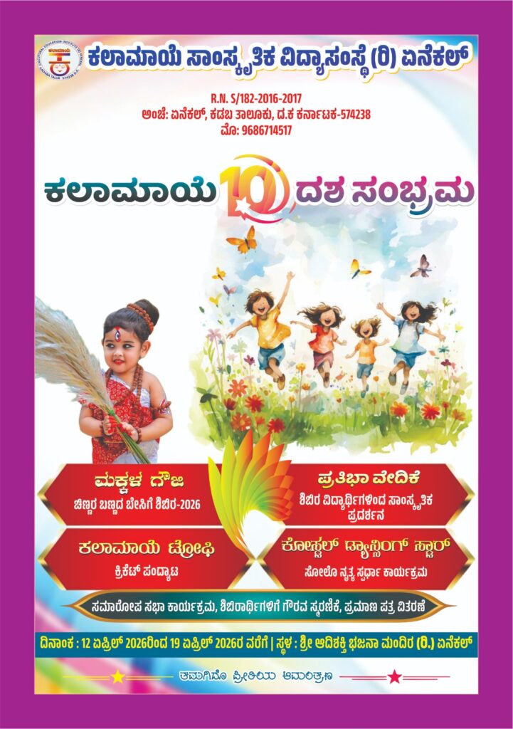 ಏನೆಕಲ್ಲು : ಏಪ್ರಿಲ್ 12ರಿಂದ 19ರವರೆಗೆ “ಕಲಾಮಾಯೆ ದಶ ಸಂಭ್ರಮ-2026” ಮಕ್ಕಳ ಗೌಜಿ ಬೇಸಿಗೆ ಶಿಬಿರ – ನಾಟಕ, ನೃತ್ಯ, ಸಾಂಸ್ಕೃತಿಕ ಹಾಗೂ ಕ್ರಿಕೆಟ್ ಪಂದ್ಯಾಟ ಕಾರ್ಯಕ್ರಮ
