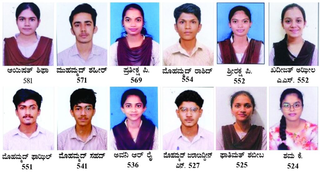 ಆಯಿಷತ್ ಶಿಫಾ 581(ವಾಣಿಜ್ಯ), ಮುಹಮ್ಮದ್ ಶಹೀರ್ 571(ವಾಣಿಜ್ಯ), ಪ್ರತೀಕ್ಷಾ ಪಿ‌ 569 ( ವಾಣಿಜ್ಯ), ಮೊಹಮ್ಮದ್ ರಾಶಿದ್ 554 (ವಿಜ್ಞಾನ), ಶ್ರೀರಕ್ಷ ಪಿ 552 (ವಿಜ್ಞಾನ), ಖದೀಜತ್ ಅಝೀಲ ಎ.ಎಸ್ 552 ( ವಿಜ್ಞಾನ), ಮೊಹಮ್ಮದ್ ಫಾಝಿಲ್ 551( ವಾಣಿಜ್ಯ), ಮೊಹಮ್ಮದ್ ಸಹದ್ 541 ( ವಾಣಿಜ್ಯ), ಅವನಿ ಆರ್. ರೈ 536 ( ವಾಣಿಜ್ಯ), ಮೊಹಮ್ಮದ್ ಜಲಾಲುದ್ದೀನ್ ಎನ್. 527 (ವಾಣಿಜ್ಯ), ಫಾತಿಮತ್ ಶಬೀಬ 525 ( ವಿಜ್ಞಾನ), ಶಮ ಕೆ. 524 (ವಿಜ್ಞಾನ) ಸೇರಿದಂತೆ ಒಟ್ಡು 12 ಮಂದಿ ವಿಶಿಷ್ಟ ಶ್ರೇಣಿಯಲ್ಲಿ ತೇರ್ಗಡೆಯಾಗಿದ್ದಾರೆ.
