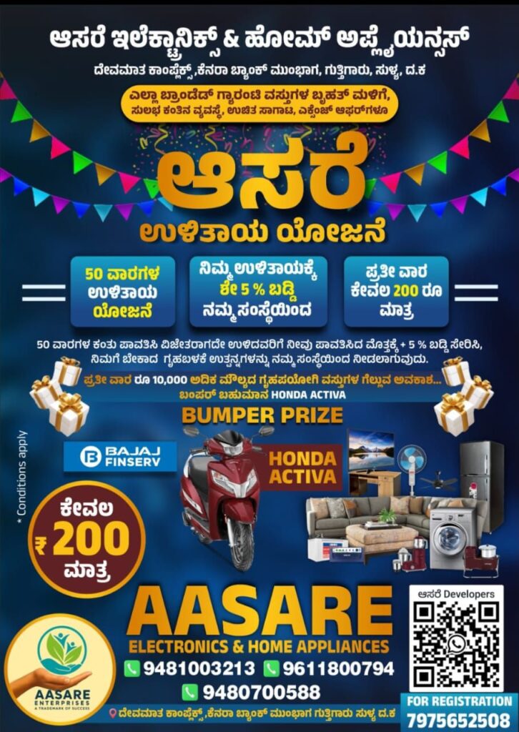ನಾಳೆ (ಏ.18) ಆಸರೆ ಎಲೆಕ್ಟ್ರಾನಿಕ್ಸ್ ನ ಆಸರೆ ಉಳಿತಾಯ ಯೋಜನೆಯ ಪ್ರಥಮ ಡ್ರಾ – ಪ್ರತಿ ವಾರ 10 ಸಾವಿರ ಮೌಲ್ಯದ ಗೃಹೋಪಯೋಗಿ ವಸ್ತು ಗೆಲ್ಲಿ