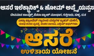 ಸುಳ್ಯ ತಾಲೂಕಿನ ಗುತ್ತಿಗಾರಿನಲ್ಲಿ ಇತ್ತೀಚೆಗೆ ಪ್ರಾರಂಭಗೊಂಡು ಗ್ರಾಹಕರ ಮೆಚ್ಚುಗೆಗೆ ಪಾತ್ರವಾದ “ಆಸರೆ ಇಲೆಕ್ಟ್ರಾನಿಕ್ಸ್” ಸಂಸ್ಥೆಯು ಇದೀಗ ಗ್ರಾಹಕರಿಗಾಗಿ ಭರ್ಜರಿ ಡಿಸ್ಕೌಂಟ್ ಸೇಲ್ ಒಂದನ್ನು ಹೊತ್ತು ತಂದಿದ್ದು, ವಿವಿಧ ಕಂಪೆನಿಗಳ ಟಿ.ವಿ, ಫ್ರಿಡ್ಜ್ ಹಾಗೂ ವಾಷಿಂಗ್ ಮೆಷಿನ್ ಗಳ ಮೇಲೆ 5% ರಿಂದ 20% ವರೆಗೆ ದರ ಕಡಿತ ಹಾಗೂ ಡೈನಿಂಗ್ ಟೇಬಲ್, ಸೋಫಾ ಸೆಟ್, ಗೋಡ್ರೇಜ್...